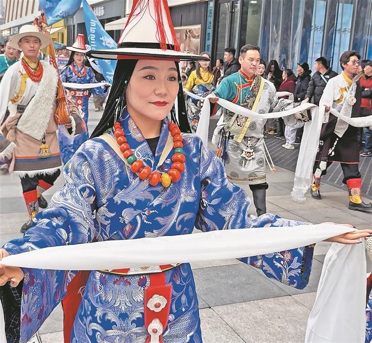 服飾巡街更是將氛圍推向高潮,身著安多藏族服飾的演員們緩緩走過廣場,鮮艷的色彩與精美的紋樣引得路人紛紛駐足,大家湊近觀察服飾上的刺繡,小聲交流著對民族文化的好奇。