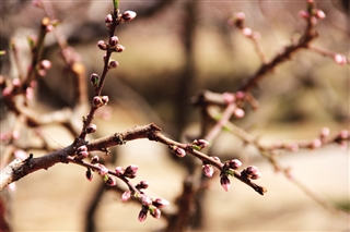 當(dāng)我們走進桃花園內(nèi),便看到一樹樹桃花含苞待放、壓滿枝頭。到底是早了幾日,但單看那末開的花蕾嫣紅小巧,便可以想象出滿園桃花似錦的景象。一束束含苞欲放的花蕾,站在青紅色的枝頭上,似點染上猩紅的胭脂扣,遮住了繁枝。其間,零星的、迎風(fēng)綻放的花兒粉嫩嫩的,攢動著張張玲瓏嬌艷的臉龐,充滿了柔情蜜意,讓人百看不厭。