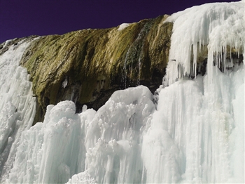 真的不知道那成片的冰是從哪里來的,大地成了冰雪的世界,它們厚厚地覆蓋在地面上,有些雪白、有些乳白、還有些滲著青碧色,玉般晶瑩剔透又那么圣潔柔亮,一層層鋪陳在地面上。那一條條懸掛在山崖邊的冰柱層層疊疊,形成了美麗的冰瀑。有些冰柱獨立地支撐著陡峭的懸崖,有些與別的冰柱聯合起來斜倚在山坡上。有些冰瀑宏大寬闊,有的冰瀑只有窄小的一綹,高高掛起,讓人想起“遙看瀑布掛前川”的句子。這些冰瀑,它們無聲地隱藏在青藏高原的大山深處,用凝固的韻律動人心魄。