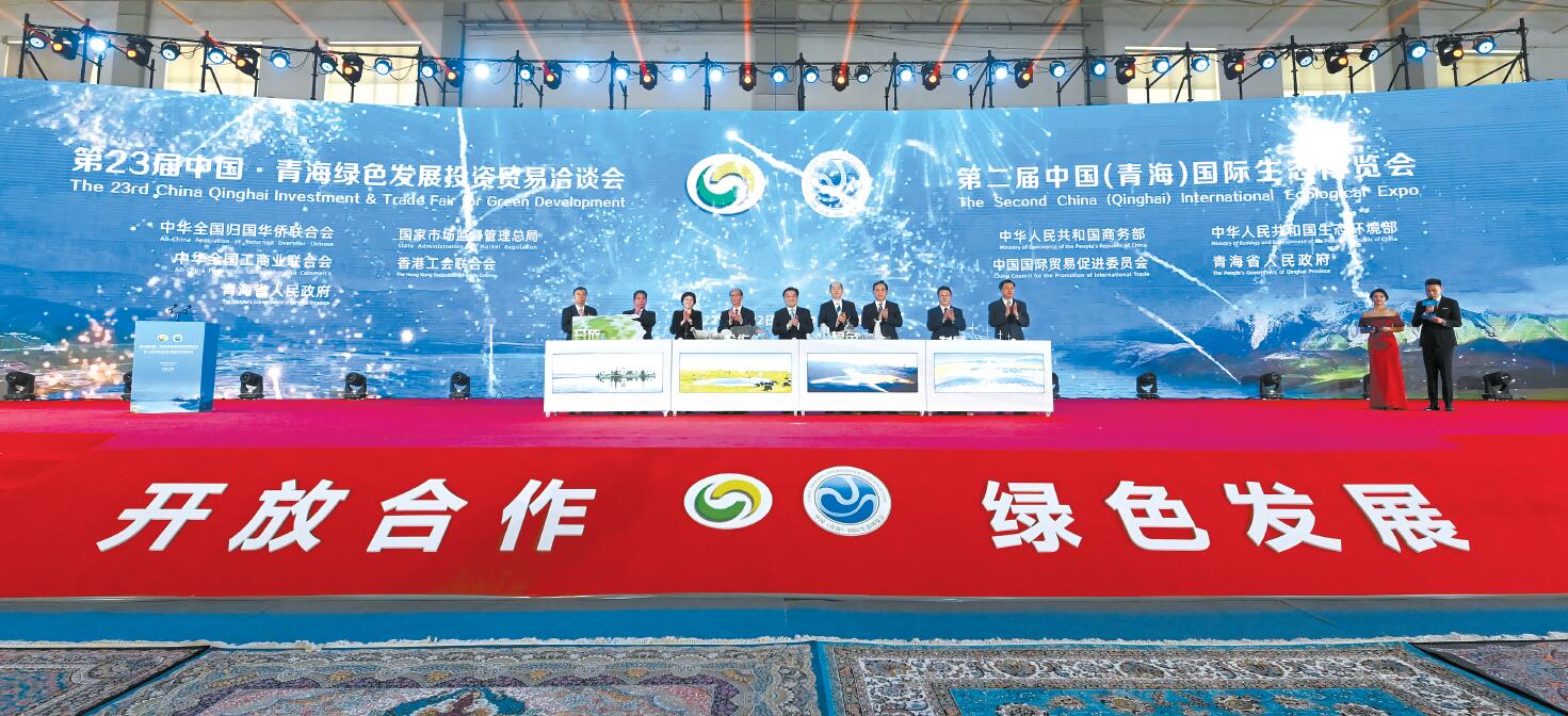 與會(huì)領(lǐng)導(dǎo)共同啟動(dòng)“第23屆中國(guó)·青海綠色發(fā)展投資貿(mào)易洽談會(huì)、第二屆中國(guó)(青海)國(guó)際生態(tài)博覽會(huì)”開(kāi)幕儀。